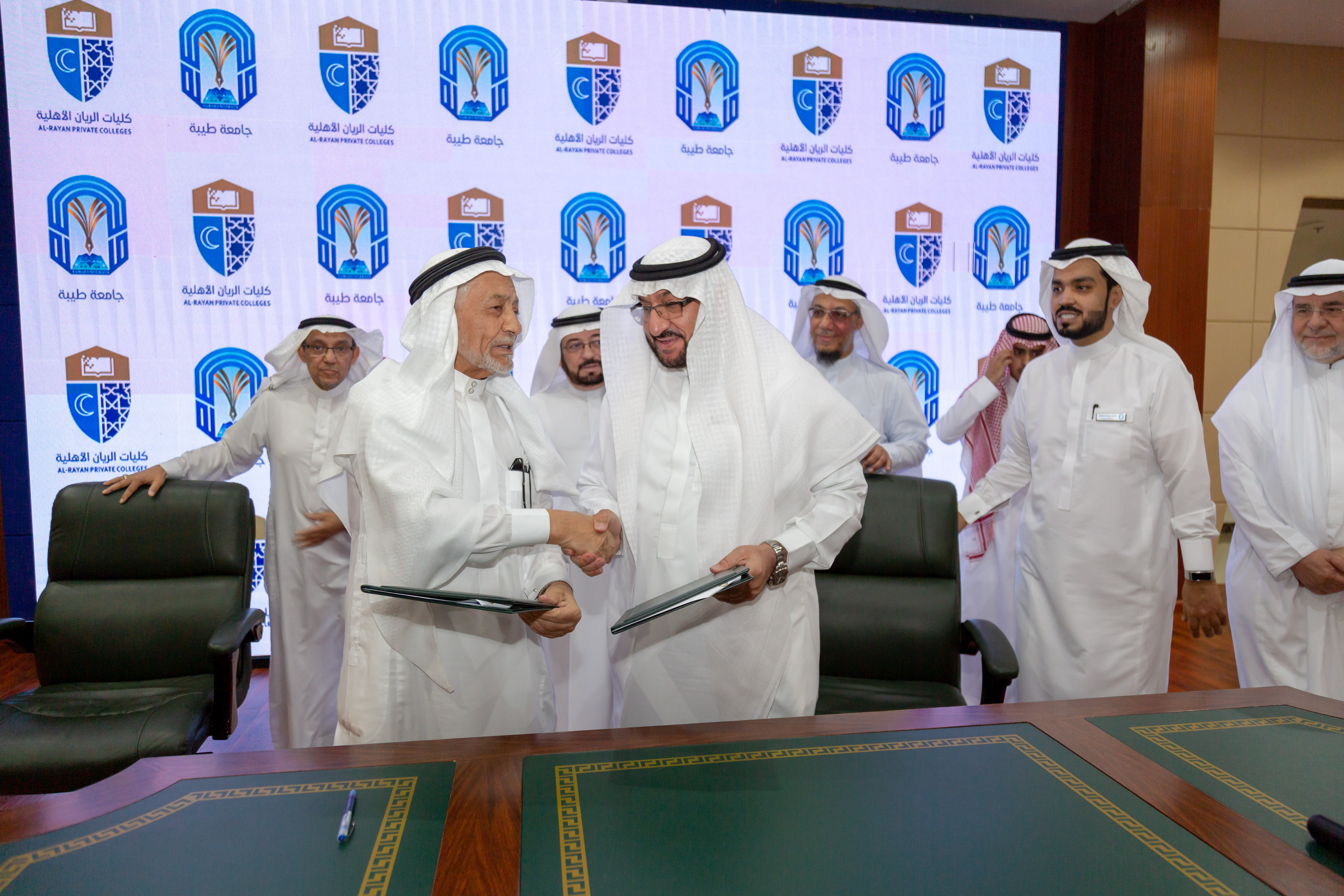 توقيع مذكرة تفاهم مع جامعة طيبة بخصوص التعاون في تطوير برامج بكالوريوس الطب البشري والتخصصات الصحية من تبادل الخبرات والخدمات والتدريب وتطوير الريادة الاكاديمية ، بحضور كل من معالي الدكتور عبدالعزيز بن قبلان السراني و الشيخ عبدالغني حسين